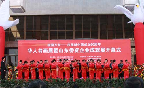 中新網(wǎng)11月10日電 據(jù)山東省僑辦消息,“祖國萬歲——慶祝新中國成立60周年華人書畫展暨山東僑資企業(yè)成就展”大型宣傳展覽活動11月6日在濟南拉開帷幕。國務(wù)院僑辦副主任馬儒沛、省政協(xié)副主席李德強、著名書畫家劉寶純出席活動開幕式并為活動剪彩。省僑辦主任王琳在開幕式上致辭,省僑辦黨組書記朱緒平主持開幕式。