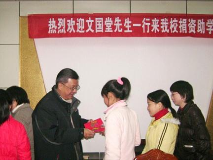 文國堂從2007年起,發(fā)起在香港的數(shù)名文氏后裔,在內地長期捐助62名貧困女高中生,給予每人每年1000元資助,并承諾捐助至大學畢業(yè)。這是他第三次來到吉安縣,與受助女生見面并發(fā)放捐助金。文國堂與來自吉安縣立中學和吉安縣二中的20名女生親切交談,聽取了學生們的心聲,鼓勵她們奮發(fā)進取。女生們現(xiàn)場合唱了《感恩的心》,已表達感激之情。