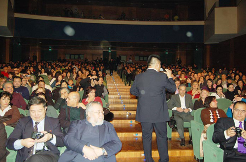 接著,由空軍政治部文工團(tuán)組成的“親情中華”藝術(shù)團(tuán)的藝術(shù)家們?yōu)榇蠹冶硌萘司实奈膴使?jié)目,龐妮娜和楊帥表演的舞蹈令觀眾耳目一新,特別是他們所表現(xiàn)出來的扎實(shí)的基本功令在場(chǎng)的意大利觀眾驚嘆不已;當(dāng)田毅走上觀眾席,“真朋友”的歌聲在每個(gè)人的身邊響起時(shí),懂中文的觀眾向意大利友人傳遞著友情。梁召今獨(dú)唱的意大利語民歌“我的太陽”一曲震驚全場(chǎng),掌聲如雷。