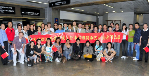 當(dāng)天在中國(guó)駐圣保羅總領(lǐng)事孫榮茂,巴西華人協(xié)會(huì)會(huì)長(zhǎng)吳耀宙及各位僑領(lǐng)的帶領(lǐng)下,當(dāng)?shù)氐膬S胞們來(lái)到國(guó)際機(jī)場(chǎng)迎接藝術(shù)團(tuán),大家都手握國(guó)旗,拉著大橫幅,滿懷激情的等待著,當(dāng)藝術(shù)團(tuán)演員們出現(xiàn)在大家眼前時(shí),許多熟悉的面孔都掛滿了笑容,僑胞與藝術(shù)家們相擁著,互相問(wèn)好。