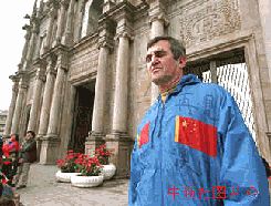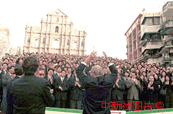 一名葡藉人士在澳門政權(quán)交接之日,身穿印有中葡國旗和寫著“再見澳門”的特制衣服,到大三巴遺址默默告別。