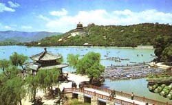 林琴南在《游頤和園記》的散文中,有一小段記從昆明湖東南向西眺望所見(jiàn)的景色:“登繡漪橋西望玉帶橋,穹然高起,于湖西前后二橋,其上皆有亭,隱隱然均不能至,而西北望玉泉之山,微見(jiàn)樓殿數(shù)疊,出萬(wàn)樹(shù)上。”昆明湖西面長(zhǎng)堤、玉帶橋、鏡橋、石橋等等是很少人走到的,不論是在龍王廟岸上看,或者在昆明湖劃船時(shí)在船上看,都有一種“隱隱然均不能至”的感覺(jué),至于玉泉山,則更是有這種感覺(jué)了。